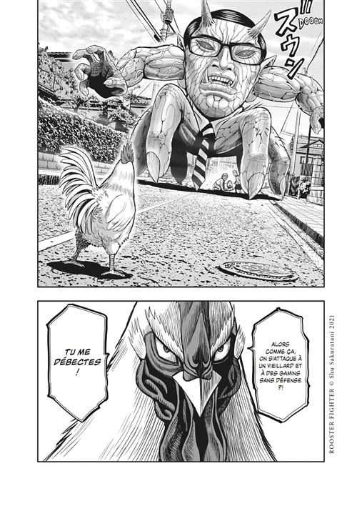 Car malgré quelques clins d’œil, le gallinacé n’a rien à envier aux autres héros de shōnen : il est fort, rapide et doté d’un puissant cocori-k.o.! Ses combats sont beaux, expéditifs et parfaitement mis en scène. Jamais on ne s’ennuie tandis que Shu Sakuratani parvient à passer d’un registre à l’autre avec fluidité. Tour à tour drôle, effrénée et parfois même touchant, son manga nous maintient en haleine.
