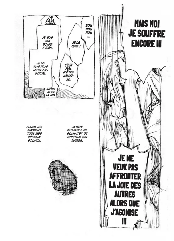 Pour accompagner ce témoignage difficile mais nécessaire, l’autrice s’appuie sur un dessin qu’elle a choisi de garder brut, sans trames, ni planches remises au propre. Comme si les émotions se couchaient directement sur le papier, l’art devient exutoire. Ainsi, ce manga n’est pas une histoire à proprement parler, mais une illustration d’un flot de pensées qui assaillait la créatrice à un instant précis de sa vie. Pourtant, au fil des pages, le lecteur est happé par ce portrait peut être sombre, mais toujours authentique qui se déploie sous ses yeux.
