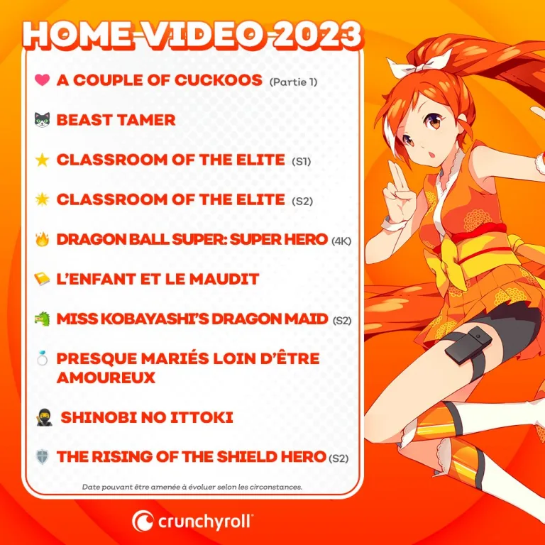 Sont ainsi attendus pour 2023 : la comédie romantique A couple of Cuckoos, la série fantasy Beast Tamer, les deux saisons de Classroom of the Elite, le film en 4K Dragon Ball Super: Super Hero, le conte noir L’enfant et le maudit, la saison 2 de Miss Kobayashi Dragon Maid, Presque mariés loin d’être amoureux, la tranche de vie scolaire Shinobi no Ittoki et la seconde saison de The Rising of Shield Hero.