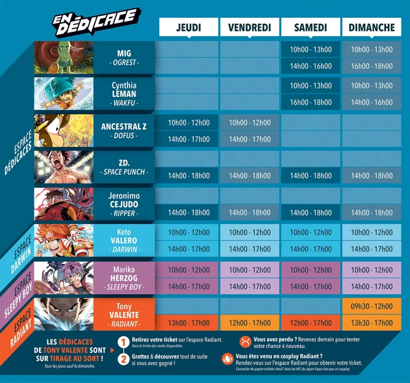 Attention ! Des modalités particulières s’appliquent pour les séances de Tony Valente ! Pour tentez d’obtenir votre dédicace de l’auteur de Radiant : Retirez votre ticket sur l’espace Radiant. Grattez et découvrez si vous avez gagné !