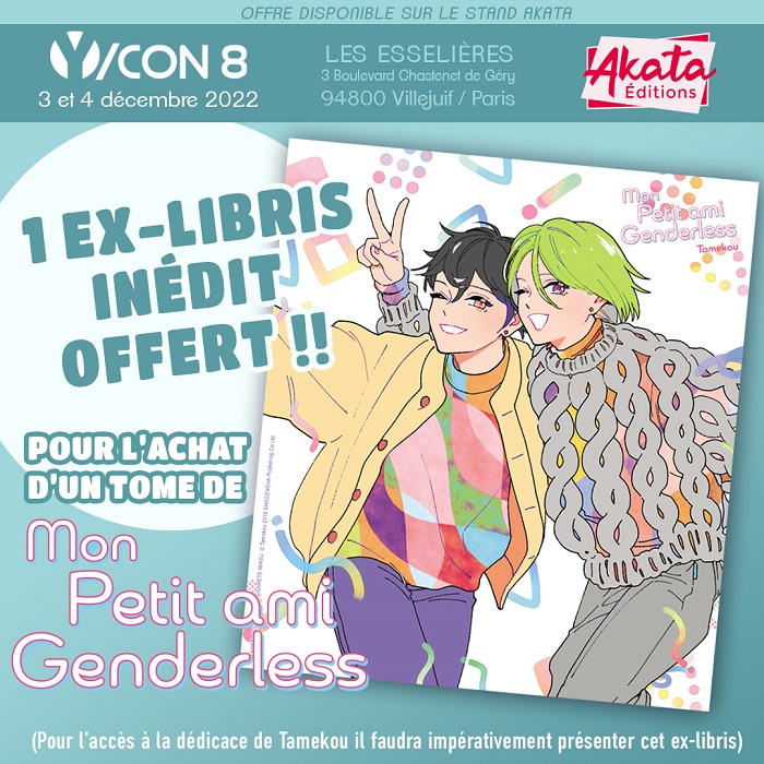 L’ex-libris exclusif sera offert pour l’achat de Mon Petit-ami Genderless sur le stand de l’éditeur. Cet ex-libris sera nécessaire pour obtenir la dédicace de Tamekou.