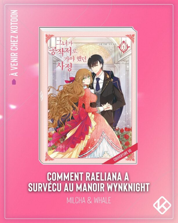 Les éditions Kotoon, spécialisées dans l’édition de webtoon au format papier, ont annoncé la sortie du manhwa Comment Raeliana a Survécu au Manoir Wynknight, pour le 20 avril 2023.
