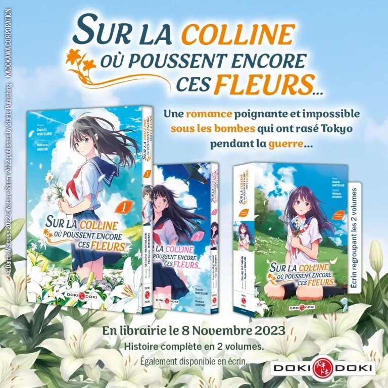 Les éditions Doki Doki annoncent la sortie du manga Sur la colline où poussent encore ces fleurs, un diptyque romantique et poignant sur fond de seconde guerre mondiale.